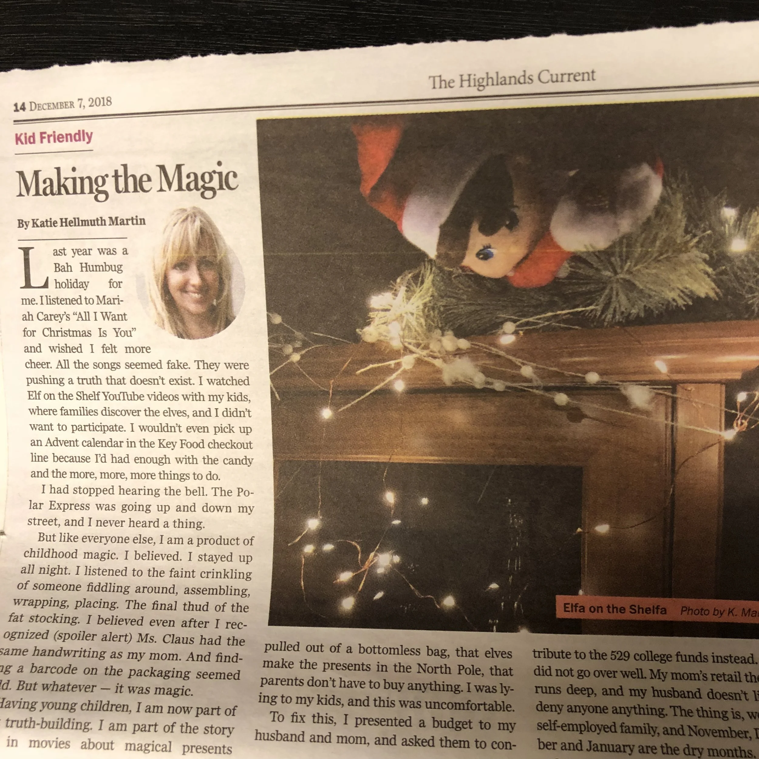 Therefore I present to you, this month’s column for the Highlands Current , “Kid Friendly,” Out on newsstands now. Last year, I had a Bah Humbug Christmas, and this column explores it. I was trying to get with Mariah Carey’s “All I Want For Christmas Is You” but instead was vibing “Where Are You Christmas?” sung by Faith Hill from the human Grinch movie (not the cartoon). I made some discoveries, and this year am fully in Making the Magic mode, hence the title of the article, but it took a few adjustments to get there...