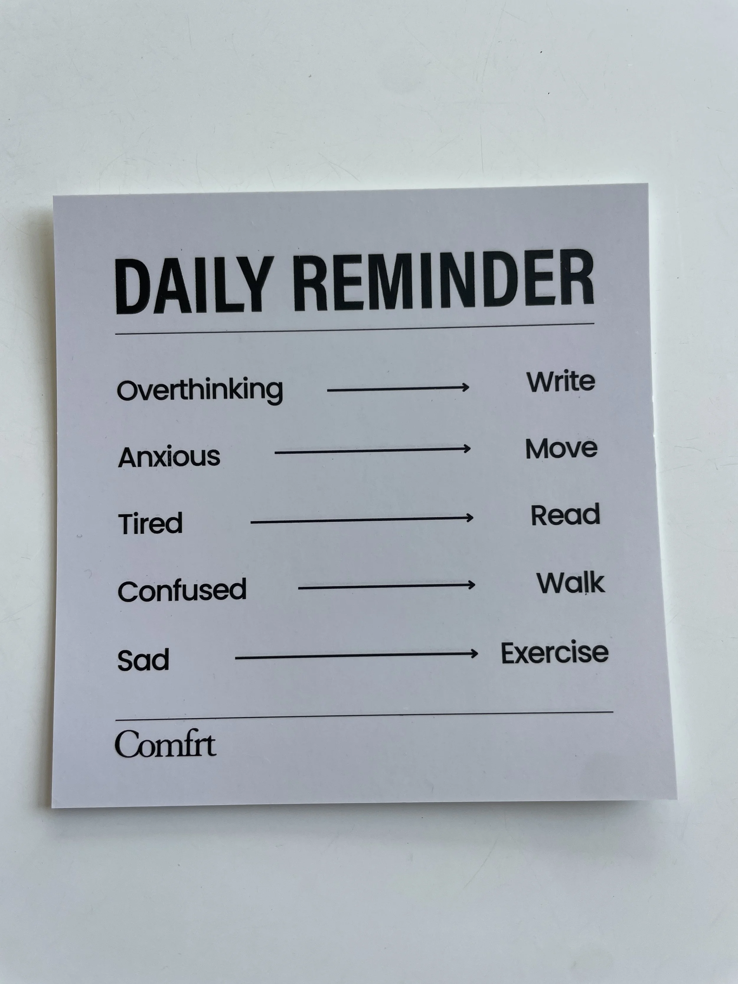 A second card was behind the first. As if we needed even more help getting through the day. Sure enough, Comfort gave us a plan for what to do for the type of day we were having. Actions to take if you are experiencing any of the following symptoms: